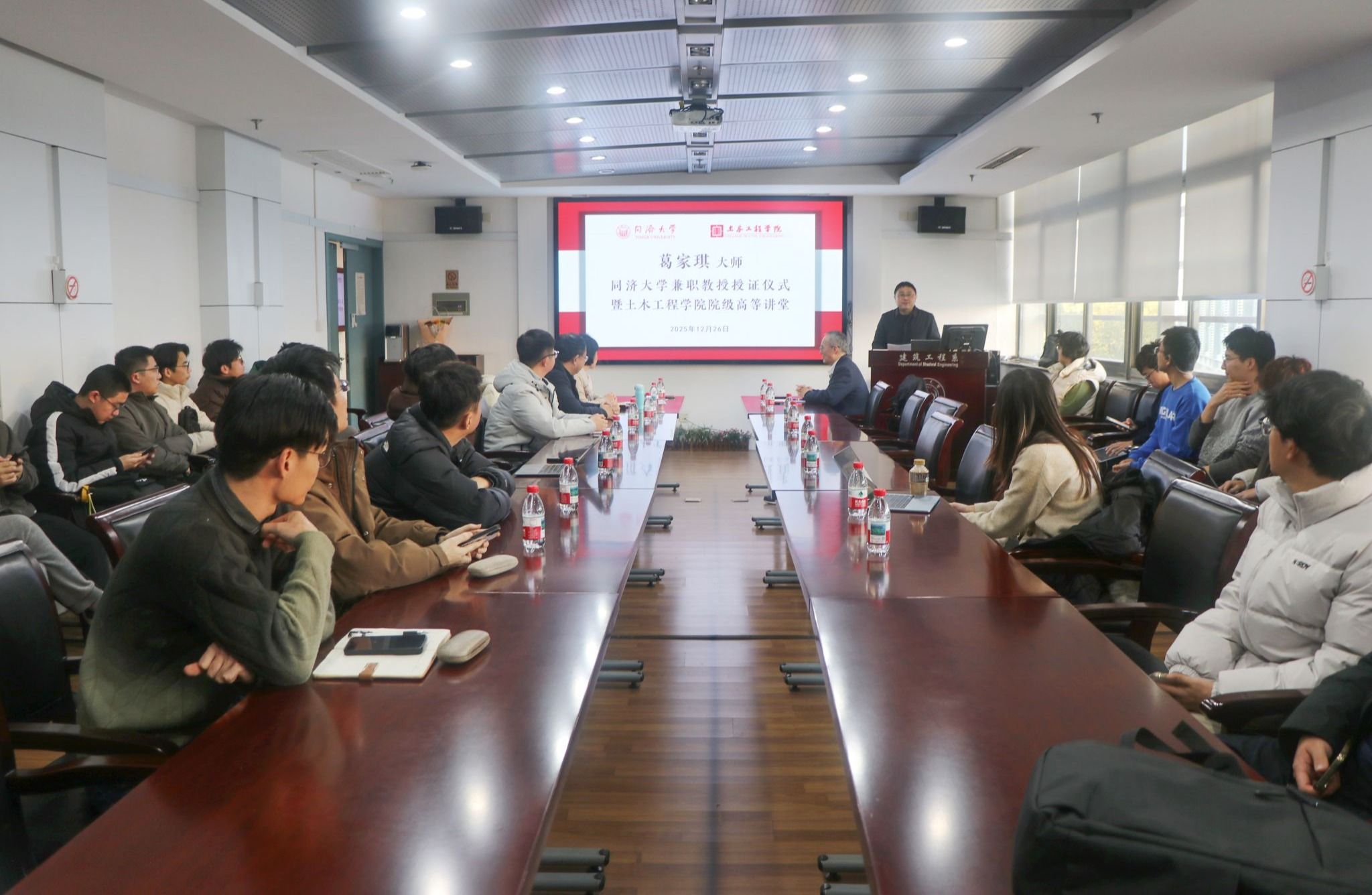 2025年12月26日下午,全国工程勘察设计大师、中国航空规划设计研究总院有限公司葛家琪先生受聘为同济大学兼职教授授证仪式暨学术报告会于土木大楼A305隆重举行。