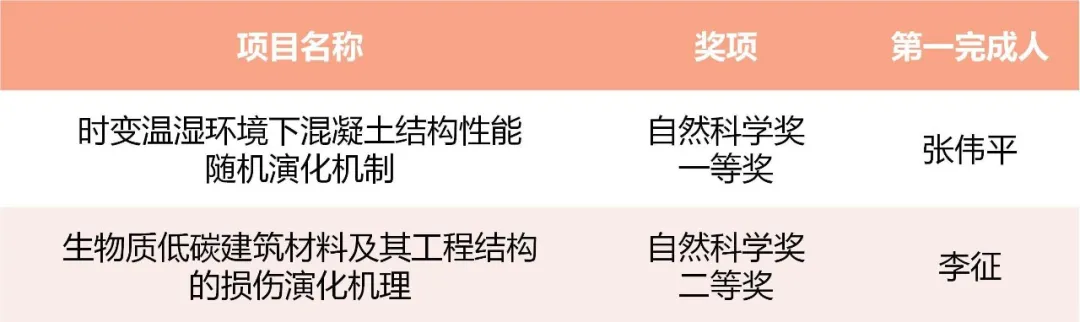 其中,张伟平教授主持完成的“时变温湿环境下混凝土结构性能随机演化机制”获得自然科学一等奖;李征教授主持完成的“生物质低碳建筑材料及其工程结构的损伤演化机理”获得自然科学二等奖;何敏娟教授主持完成的“钢结构风力发电塔关键技术创新和工程应用”获得科技进步二等奖。