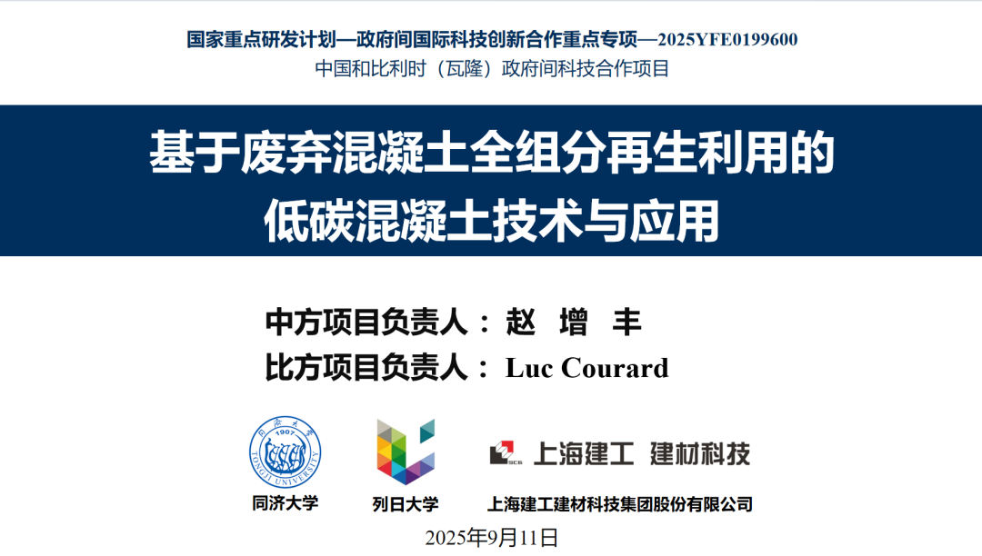 2025年09月11日,国家重点研发计划“政府间国际科技创新合作”重点专项“基于废弃混凝土全组分再生利用的低碳混凝土技术与应用”项目启动会暨实施方案论证会在同济大学顺利召开。项目由同济大学、比利时列日大学、上海建工建材科技集团股份有限公司合作承担,同济大学土木工程学院赵增丰研究员与列日大学Luc Courard教授分别担任中外项目负责人。