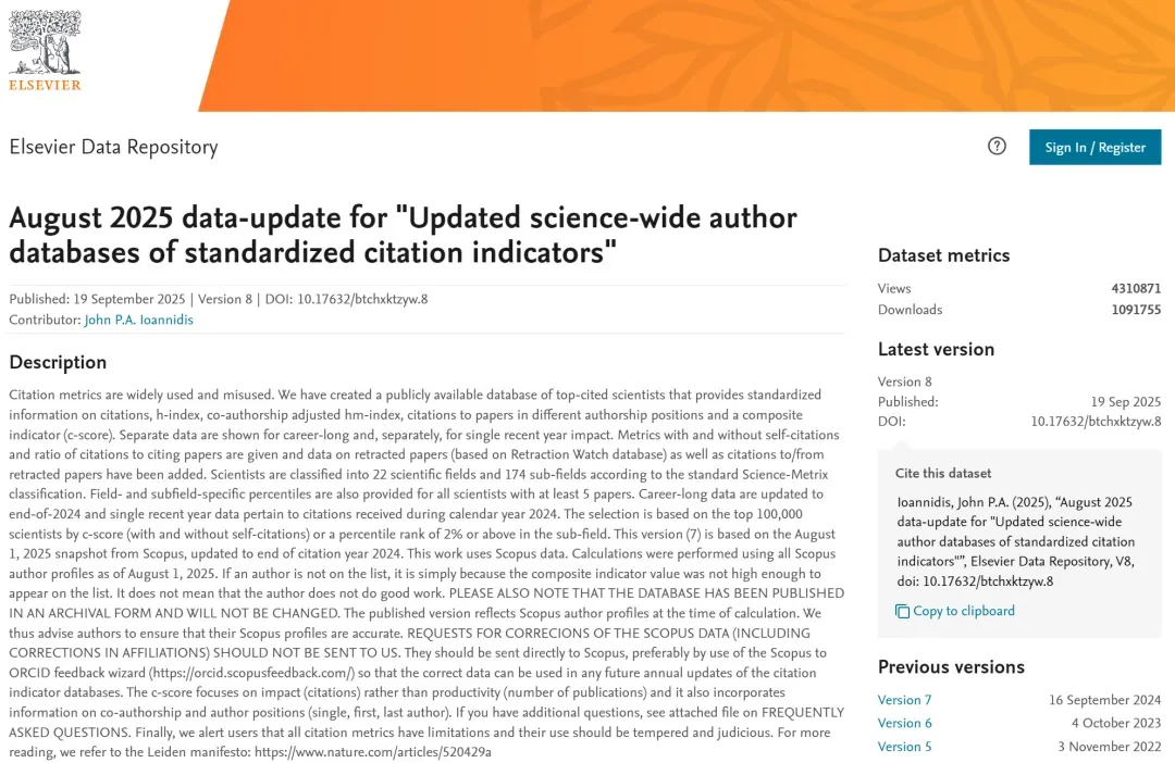 完整榜单链接请见:https://elsevier.digitalcommonsdata.com/datasets/btchxktzyw/8