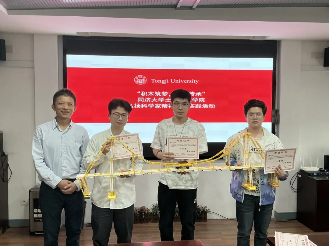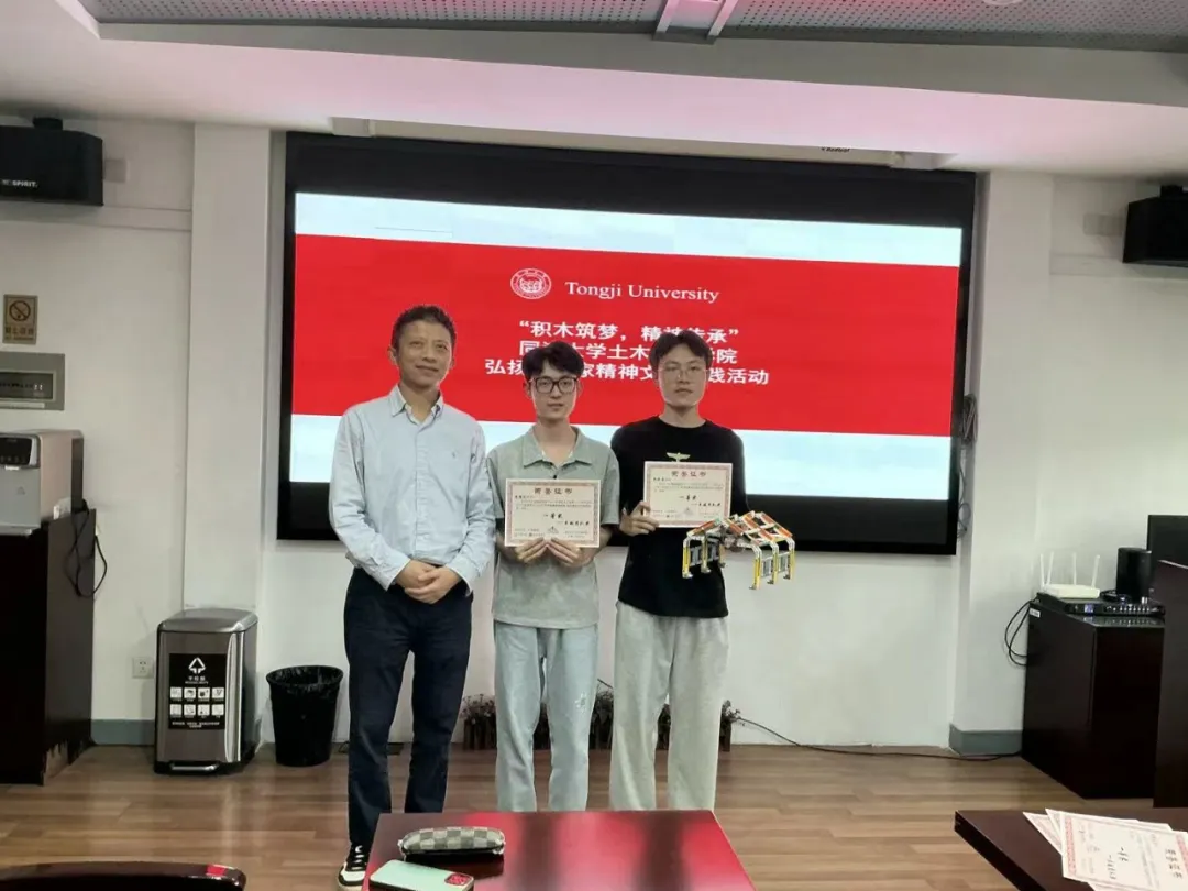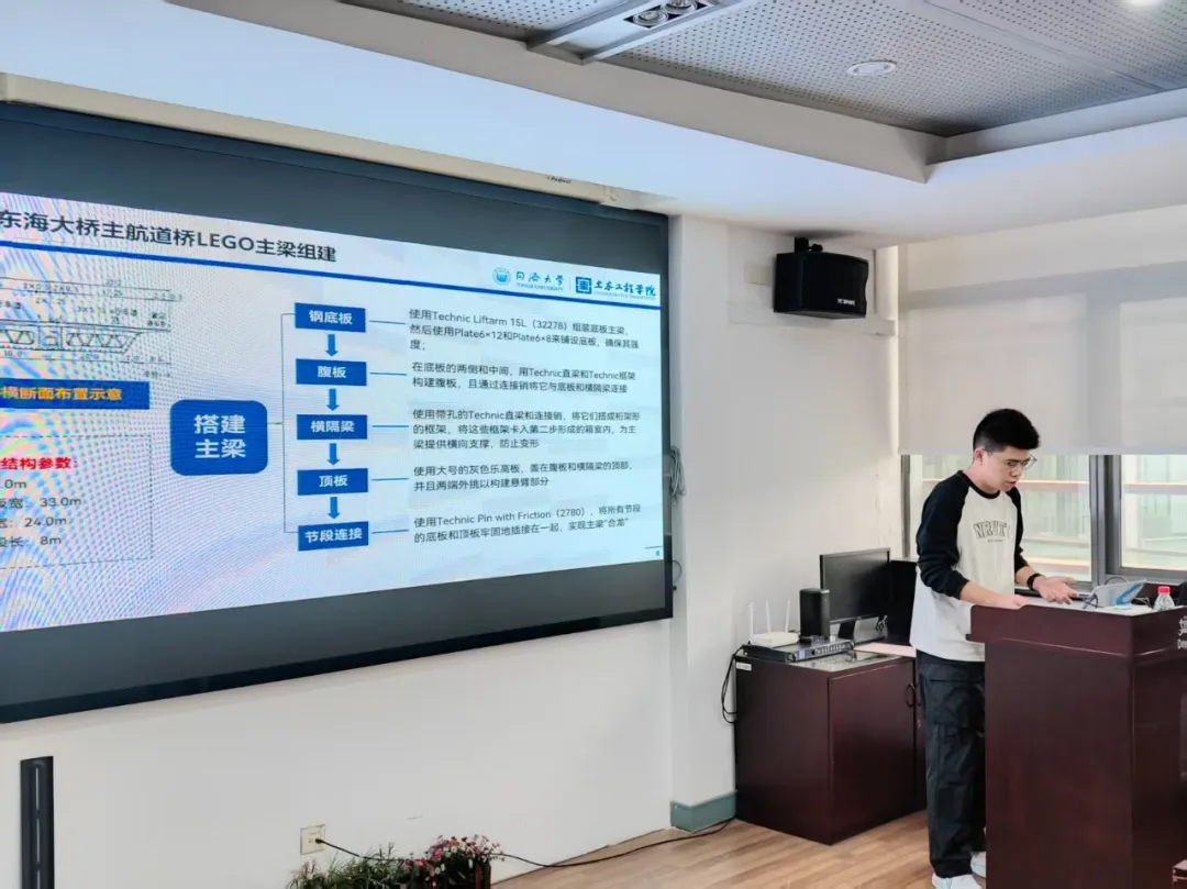 第二阶段,同学们以党支部为单位组建小队,各参赛队伍从三位院士参与的著名工程案例中选定复刻对象,范围涵盖工程整体结构或其关键节点的核心特征;复刻的核心原则在于精准还原工程的“结构功能”而非外形,各队伍先行系统研读案例资料与学术论文,形成严谨的结构分析思路后再进行积木搭建;所有复刻结构必须符合受力平衡、稳定性等结构力学基本原理,确保模型的工程逻辑合理;同时鼓励通过“对比试验”来特色化呈现设计价值,如搭建不同方案模型并对比测试其承载能力、抗变形性能等指标,以直观展现原工程设计的科学性与优越性。