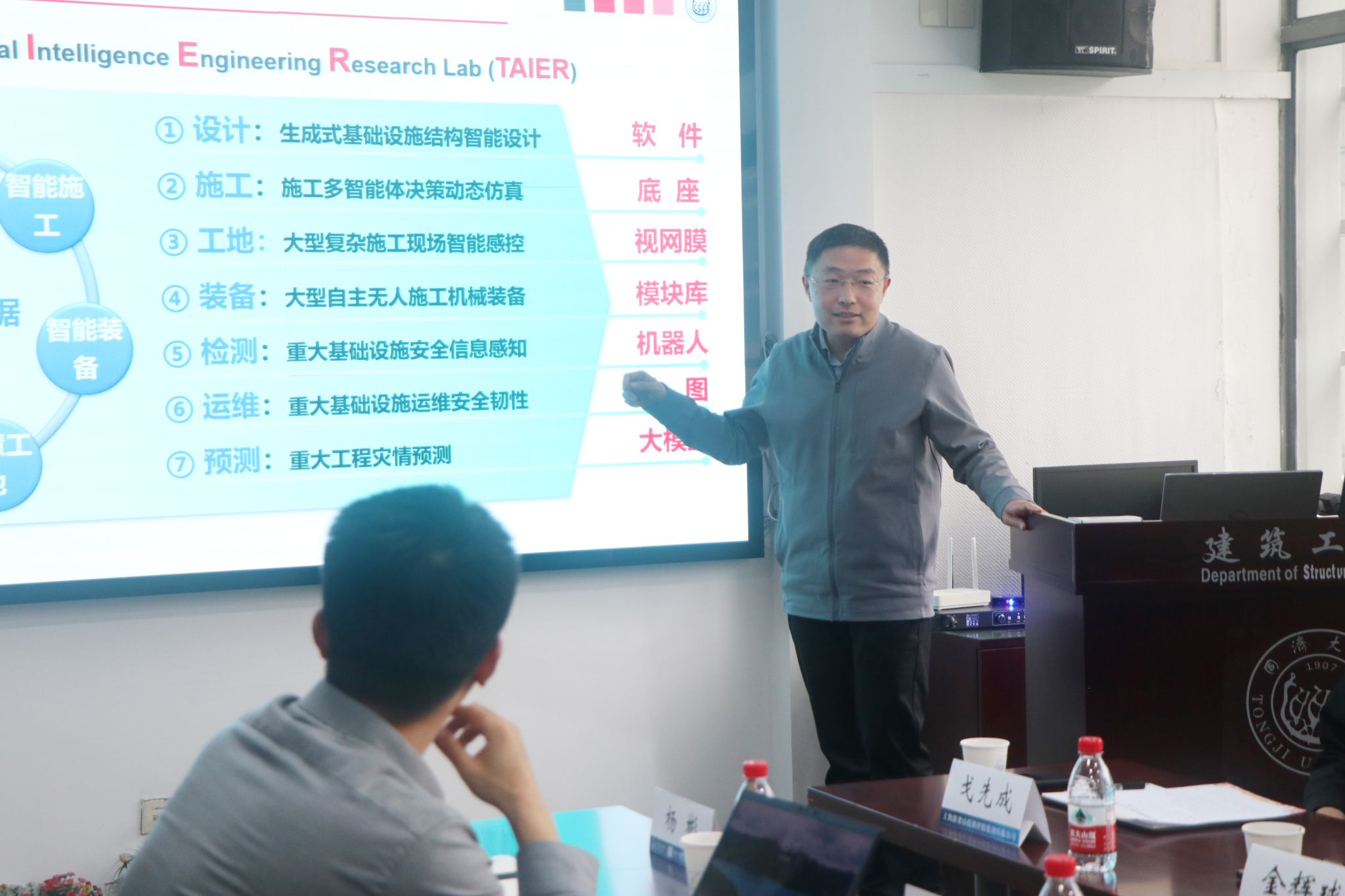 在技术分享环节,同济大学多位教授带来了行业前沿研究成果:姜旭教授围绕《基于高性能材料的既有结构改造与性能提升》,分享了高性能材料Fe-SMA在既有钢结构与混凝土结构性能提升中的创新应用;杨彬教授以《基于大语言模型的建造过程仿真推演》为题,展示了人工智能技术赋能建筑工程数字化、智能化建造的最新进展;张自立教授则聚焦《海上风机动力学、载荷、控制和设计》,深入解读了海上风电工程领域的关键技术与发展前景;任晓丹教授系统梳理了建筑工程行业的发展趋势,为双方把握行业方向、谋划合作布局奠定了坚实基础。