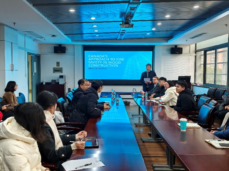 2026年3月5日下午,加拿大知名建筑防火科学与工程专家、CHM防火工程咨询公司创始人Steven Craft博士应邀通过线上线下结合的方式作题为 “Canada’s Approach to Fire Safety in Wood Construction(加拿大木结构建筑防火安全与实践)” 的文远讲坛报告,报告由同济大学土木工程学院副院长宋晓滨教授主持。同济大学土木工程学院何敏娟教授、东南大学张晋教授、上海建筑科学研究院许清风研究员、华东建筑设计研究院消防科技研究所消防顾问方珉、加拿大木业协会标准规范顾问张海燕等业内专家,以及同济大学土木工程学院师生和线上参与者共计约100人参加了本次讲座。